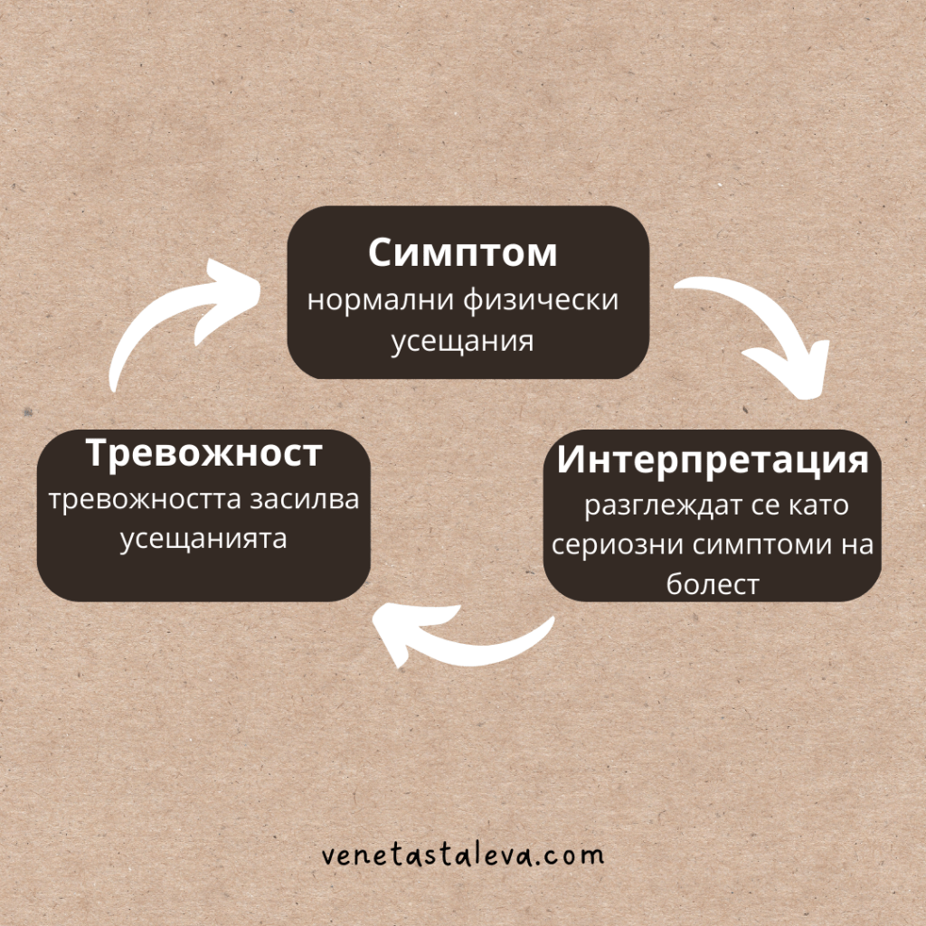 Мисловния модел на паник атаката в когнитивно-поведенческата терапия изглежда така: